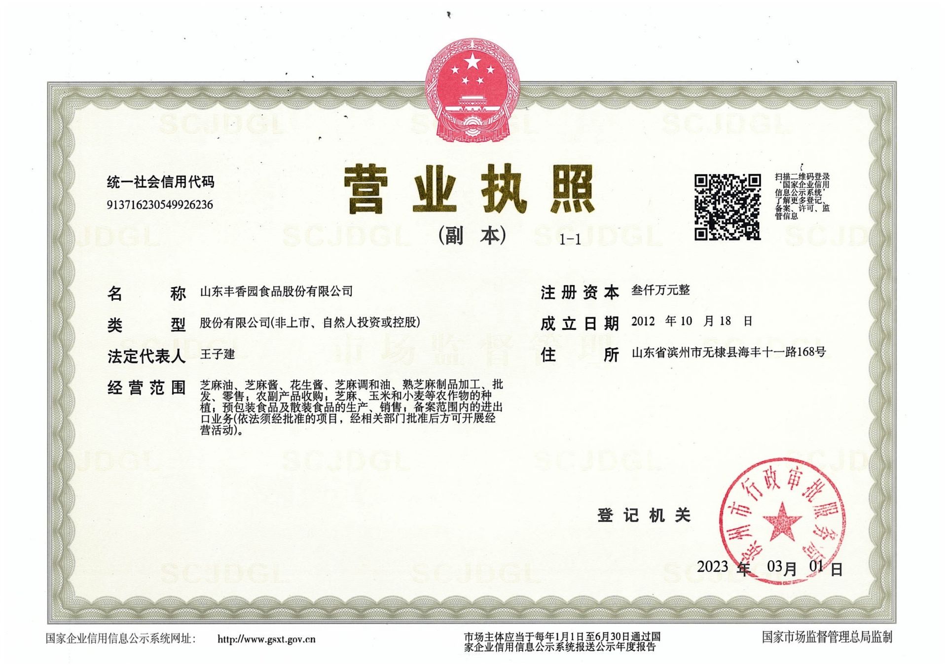 山東豐香園食品股份有限公司位于無棣縣西城工業(yè)園,成立于2012年,注冊資本3000萬元,員工60多人,年銷售收入8000多萬元,是“國家高新技術(shù)企業(yè)”、“中國好糧油”示范企業(yè)、“食安山東”示范生產(chǎn)加工企業(yè),公司集綠色、有機(jī)芝麻食品標(biāo)準(zhǔn)化、生產(chǎn)加工、研發(fā)、出口銷售為一體的山東省農(nóng)業(yè)產(chǎn)業(yè)化“重點(diǎn)龍頭企業(yè)”。 公司獲得HACCP國際質(zhì)量體系認(rèn)證、ISO9001:2015質(zhì)量管理體系認(rèn)證,產(chǎn)品獲得美國FDA認(rèn)證、美國、歐盟有機(jī)食品認(rèn)證、英國BRC體系認(rèn)證、A級綠色食品認(rèn)證、GB國標(biāo)有機(jī)食品認(rèn)證。 公司主要產(chǎn)品有芝麻油、芝麻醬、花生醬、芝麻粉和烘焙芝麻、兒童芝麻食品系列等六大種類上百個(gè)品種,產(chǎn)品出口美國、日本、韓國、新加坡、俄羅斯、澳大利亞、美國、等30多個(gè)國家。2018-2019年連續(xù)兩年芝麻食品出口量排名山東省第三位、濱州市第一位。 山東豐香園食品股份有限公司是國家級高新技術(shù)企業(yè),建有省級“一企一技術(shù)”研發(fā)中心、市級企業(yè)技術(shù)中心和市級工程實(shí)驗(yàn)室、市級工程技術(shù)中心等多個(gè)創(chuàng)新平臺(tái),擁有發(fā)明專利2項(xiàng),實(shí)用新型專利21項(xiàng),先后獲得省級“專精特新”中小企業(yè)、市級農(nóng)業(yè)產(chǎn)業(yè)化聯(lián)合體、科技型中小企業(yè)、濱州市級瞪羚企業(yè)、市級“一企一技術(shù)”創(chuàng)新企業(yè)和濱州市新興產(chǎn)業(yè)“白名單”企業(yè)等榮譽(yù)稱號(hào)。